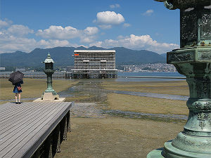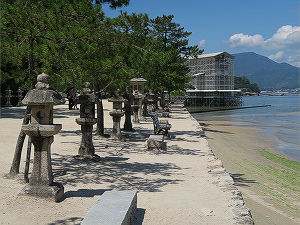 厳島神社を巡る回廊をブラブラ歩くと、大鳥居を見渡せる平舞台に至る。この日の干潮時刻は13時頃であり、私が厳島神社を訪れた10時半頃はかなり潮が引いている状態だった。干潮時には大鳥居まで歩いて行けるとの事だったが、この時刻は大鳥居の周りにはまだ水が引かずに残っていた。ただ、多くの観光客が海面に降り、大鳥居と神社の間の砂州を歩き回っていた。