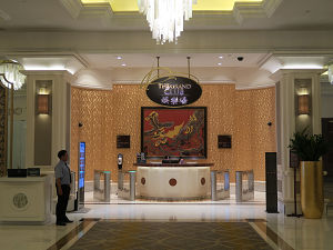 見るとテーブルのほとんどはバカラだった。ただ、バカラはどのテーブルもミニマムがUS$100と表示されている。うーん、これは敷居がちと高い。少しバカラテーブルを眺めてみると、このバカラにはタイガー&ドラゴンというサイドベットがある。いったいこのサイドベットはどんなルールなんだろうと思い、テーブルに記されていた配当の条件を詳しく確認してみる。すると、要はスーパー6に対するサイドベットの変形に相当する賭け方で、グランドタイガー・スモールタイガー・グランドドラゴン・スモールドラゴンの4通りの賭け方ができる事が分かった。グランドタイガーはバンカーが3枚引いて6で勝った場合に当たり(配当50倍)、スモールタイガーはバンカーが2枚引いて6で勝った場合に当たり(配当22倍)、グランドドラゴンはプレイヤーが3枚引いて7で勝った場合に当たり(配当30倍)、スモールドラゴンはプレイヤーが2枚引いて7で勝った場合に当たり(配当15倍)。つまり、グランドタイガーとスモールタイガーがバンカーのスーパー6に対するリスクヘッジとの位置づけになる。通常サイドベットのスーパー6は配当12倍なので、タイガー&ドラゴンはそれより期待値の高いベットとなっている。これは面白そうだ。是非このバカラでサイドベットを試してみようと思ったが、$100の勝負だとあっという間に予算が無くなってしまいそうだ。なので、US$500以上勝てればバカラで勝負しようと誓い、最初はMIN$10のブラックジャックに参戦した。